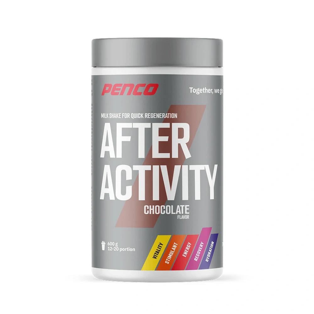 Penco® AFTER ACTIVITY je energetický regenerační nápoj, obnovující po zátěži (tréninku, závodu či nadměrné fyzické námaze) rovnováhu v organizmu. Doplňuje zásoby glykogenu ve svalech a játrech, a tím pomáhá předcházet potréninkovým katabolickým procesům. Energii dodávají jak jednoduché cukry (sacharóza, glukóza), tak i výše molekulární polysacharidy, aminokyseliny a proteiny. Bílkovinnou složkou jsou syrovátkové proteiny s vysokou biologickou hodnotou, které se poměrně rychle resorbují a pomáhají přepnout katabolický proces na anabolický.
