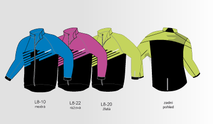 popis: polovolný stříh, prodloužený zadní díl, odvětrávání bočními panely, volné zakončení, stojáček, podložený zip, sublimace, reflexní prvky.